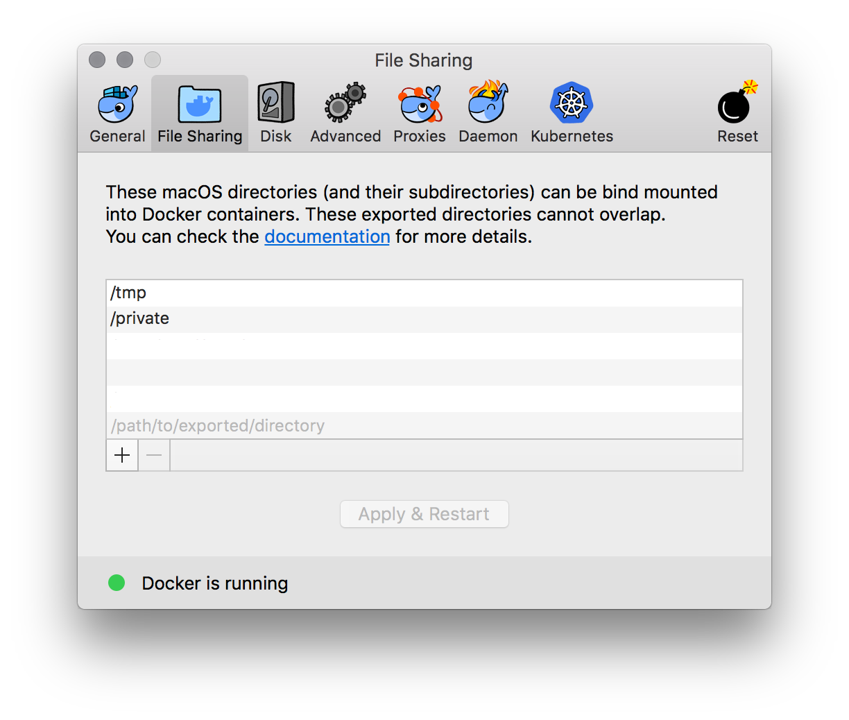 One good thing is that the error is very explicit and it tells you right there where to get more information to fix it. It is still odd to get this error since I’m running docker for mac and it feels native. Here’s the catch: it feels and sounds native, but it is not native. Docker describes how Docker for Mac differs from Docker Toolbox. They do describe it as a native application but only because it uses Hyperkit, although this means there is still a VM between OSX and Docker. It is simpler to use, but we have to keep this structure in mind. After looking into how Docker for Mac runs it is easier to understand why we cannot mount folders into our Docker containers a la willy-nilly. The fix is to let the Docker VM know about the folder(s) we want to mount. We configure the paths the Docker VM can see in the Docker settings. This is called File Sharing.